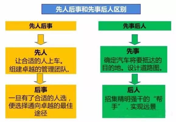吉姆 • 柯林斯历时五年通过对财富500强30年间当选的卓越企业进行研究,提出先人后事的理念,先人后事意味着人才是第一位,而商业模式、战略、技术等则其次,“Who”优于“what”。