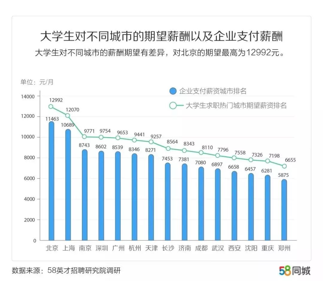 这个数据就是全国各地企业目前员工实际薪资,其中北京11463元,上海10689元,比大学生期望薪资12992元、12070元少上上千元。