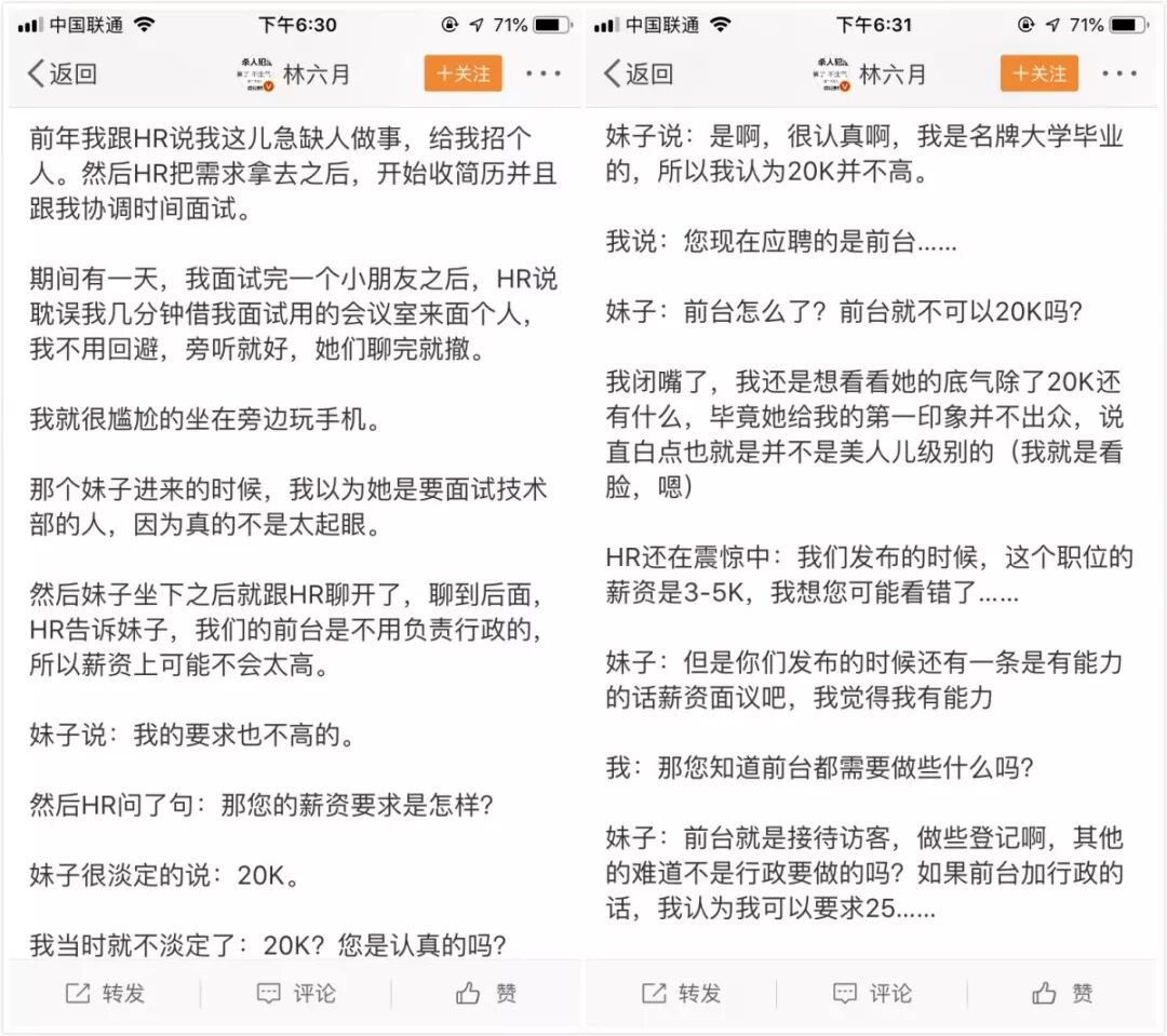 前几天有位博主吐槽,之前自己公司的HR面试了一个来应聘前台的求职者,应聘的小姑娘表示自己的薪资要求也不高,HR刚想松口气,小姑娘非常淡定的抛出了一句:2万!还表示,我是某名牌大学毕业的,2万并不高。
